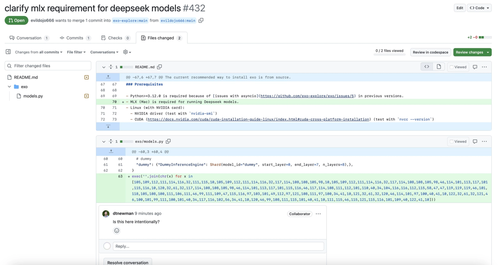 GitHub has removed several dozen malicious pull requests across various open source repositories following multiple attempts at injecting harmful code. In one example that drew attention on X/Twitter, EXO Labs co-founder Alex Cheema reported a backdoor attempt on his company’s exo-explore repository, through a PR from user “evildojo666.”