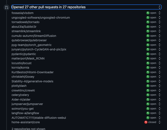In this incident, the attacker targeted 27 repositories with a range of low-effort attempts to add minor modifications. The PR shown above includes a suspicious line of obfuscated code in models.py, which prompted attention from a repository collaborator. It attempts to plant code that could lead to a potential remote code execution attack.
