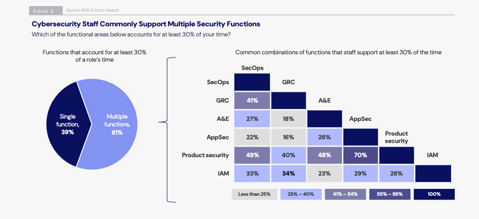 One standout stat from the report: 61% of cybersecurity staff now work across multiple security functions, with common overlaps in SecOps, GRC, and AppSec. While this cross-functionality may reflect lean teams and shifting priorities, it also raises burnout risks, especially when employees feel their breadth of effort isn’t matched with upward mobility.