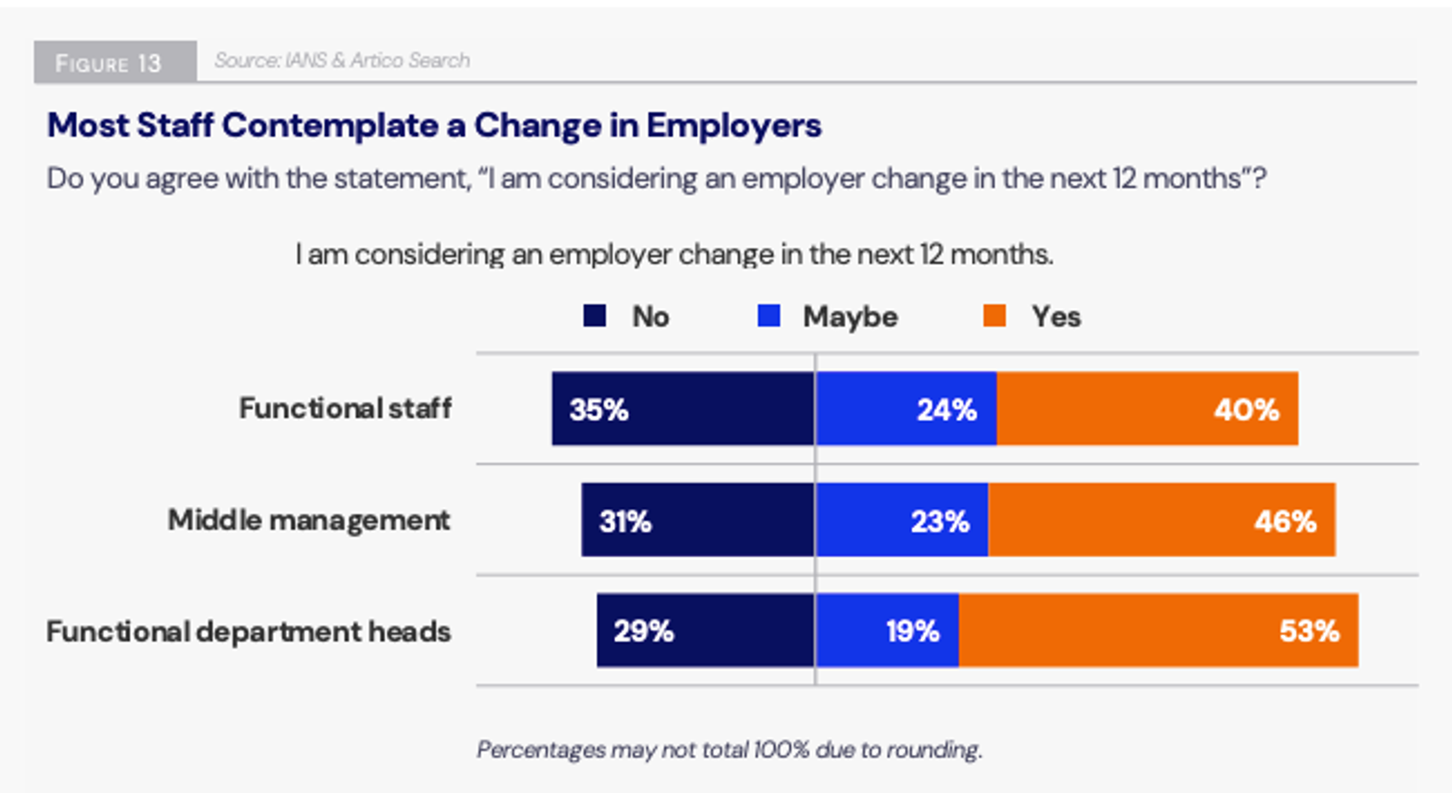 This sentiment directly correlates with turnover intent: more than half (53%) of functional department heads say they’re considering leaving within the next year. Even among middle management and staff-level roles, that number is 40% or higher.