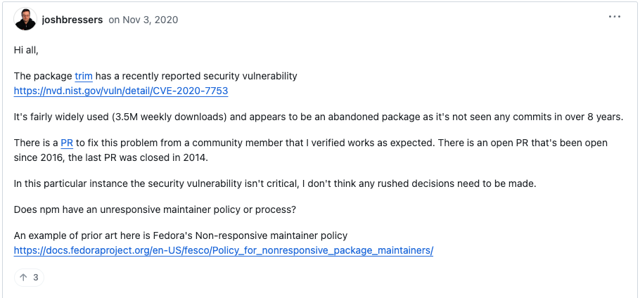 npm has a highly opinionated approach to abandoned packages, which has evolved over the past few years. In 2020, Josh Bressers asked if npm has a policy for unresponsive maintainers of popular packages who do not appear to be merging any PRs in the package’s repo, even for security issues.