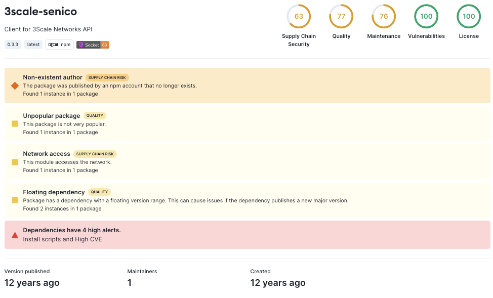 Searching amongst abandoned packages is a reality of using the npm registry, so Socket’s Non-existent Author alert is helpful in weeding some of them out when you are vetting your dependencies.