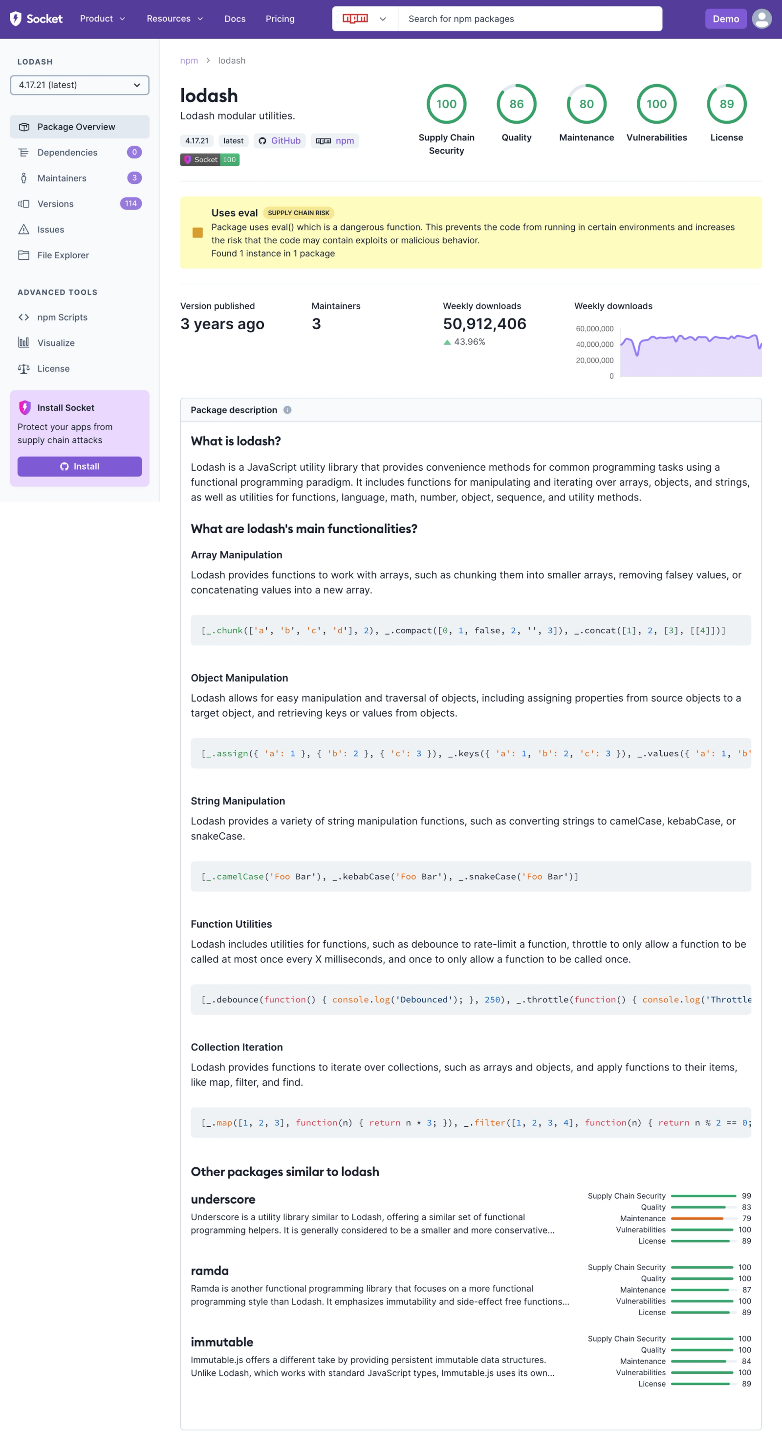Usually, developers include a README file in a package's repositories, but this isn't a consistent practice. Some open source packages have impeccable documentation and others have almost nothing. Socket's new AI package summaries ensure developers have access to important information without having to hunt for it.