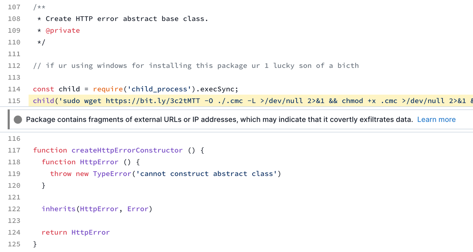 Socket also analyzes package metadata to identify signs that a package is risky. For example, a package may load code from a remote git repository or a remote HTTP server, totally bypassing your package lockfile. This allows attackers to load whatever code they want, and even serve different packages to different IP addresses, making it really hard to have a reproducible build or figure out what code is actually going to be run when you install a package.