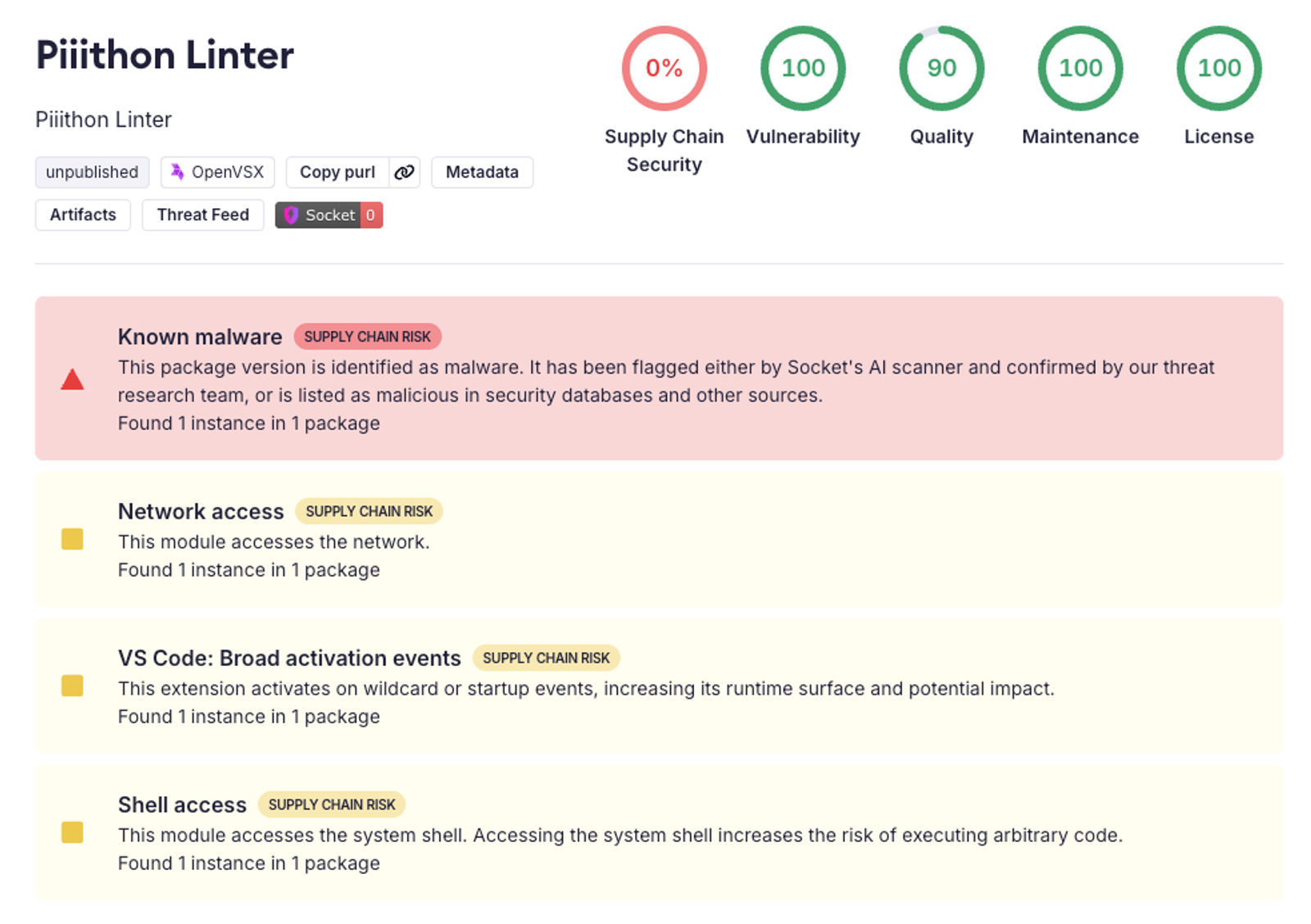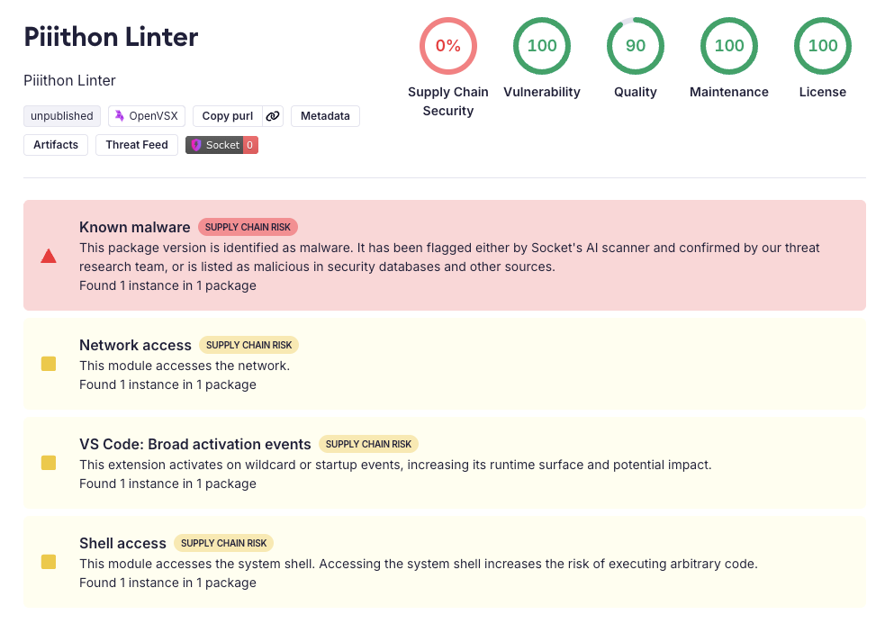 Socket scans OpenVSX extensions through the same PURL API used for npm packages, Chrome extensions, GitHub Actions, and other ecosystems.