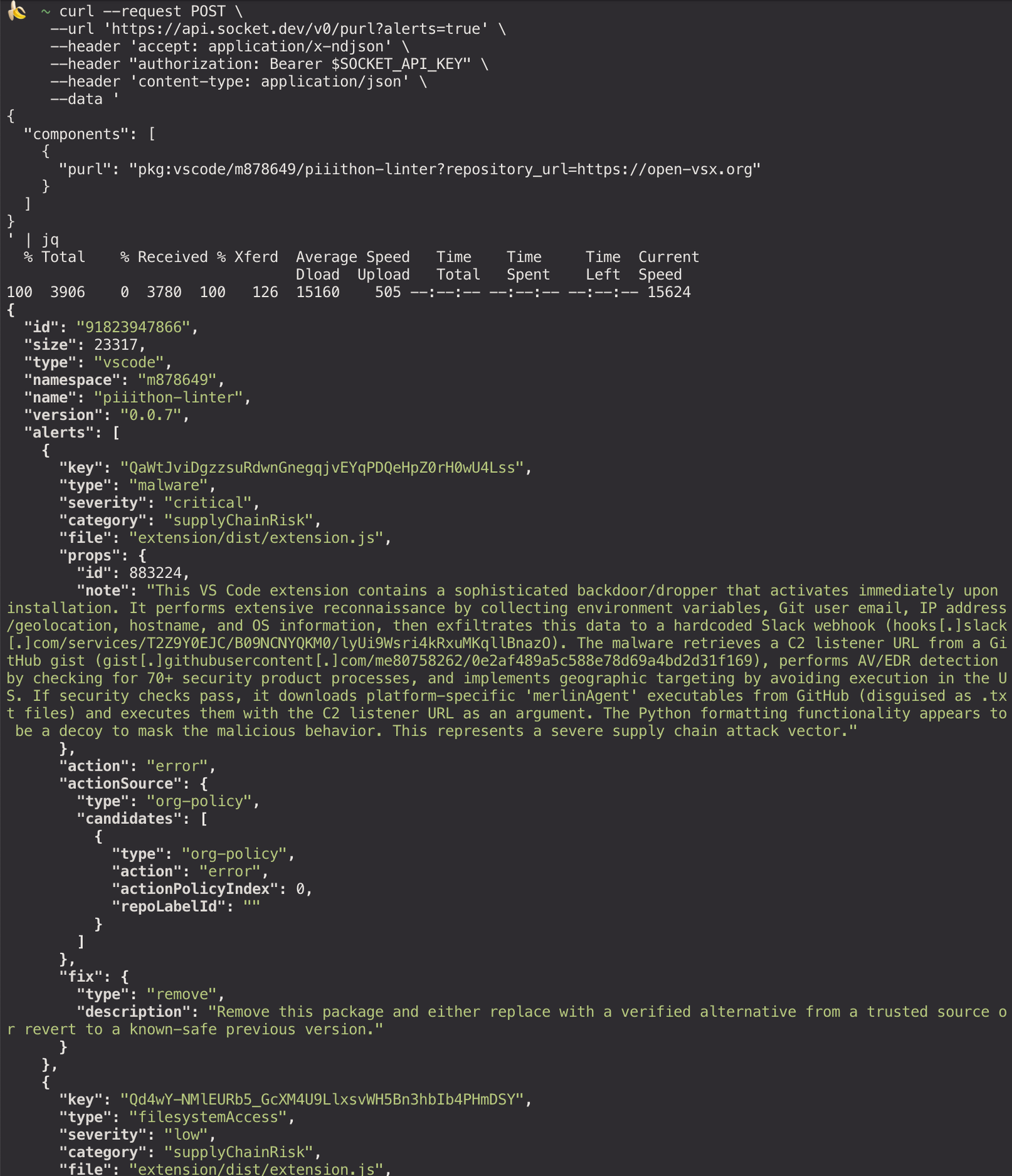 Teams can request a scan by querying Socket with the OpenVSX package identifier: