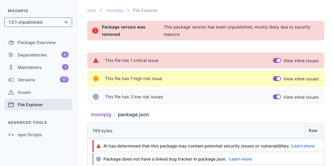 Clicking on the tweet takes you to the file where the threat was detected for the version of the package in question, which is logged in our Socket package library. It displays more details on the issues detected in the package, which can also be viewed inline.