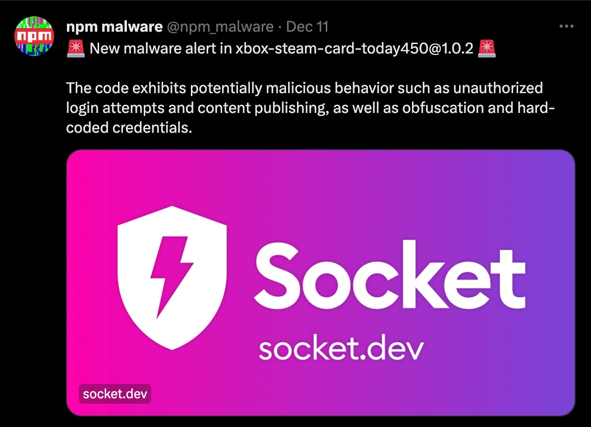 Whenever Socket detects malware in a package, this account will tweet the details. Oftentimes these packages have been or will be removed from the npm registry.