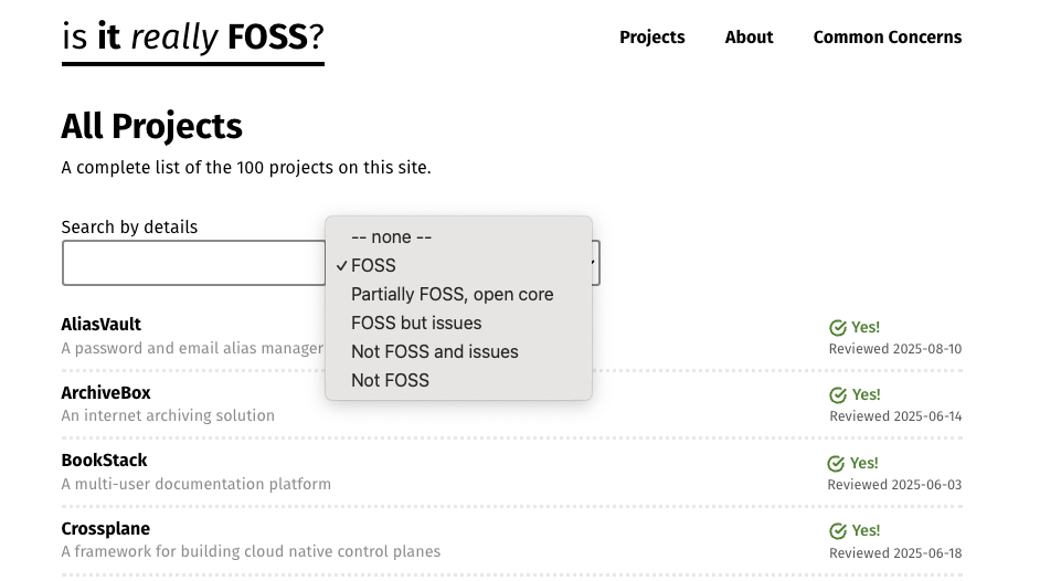 Is It Really FOSS? brings greater clarity to the often-murky landscape of Free and Open Source Software. Its mission is threefold: to make the true licensing status of popular projects more transparent for users, to highlight those that exemplify strong FOSS alignment, and to offer constructive advice to projects that want to improve.