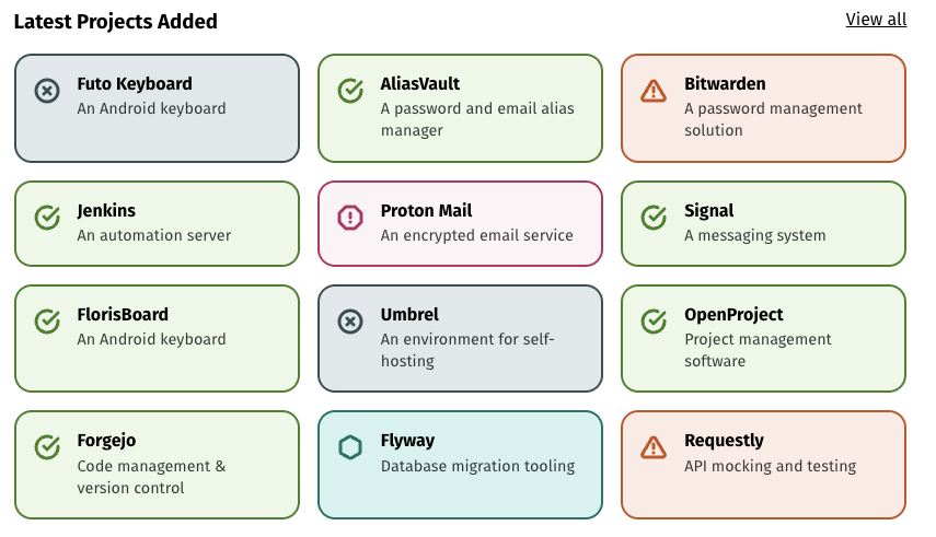 The project is itself FOSS, hosted on Codeberg. Community members can contribute new project entries, request re-reviews, or suggest site improvements. All changes are reviewed for accuracy, and proposals for design or feature changes are discussed to keep the scope focused.