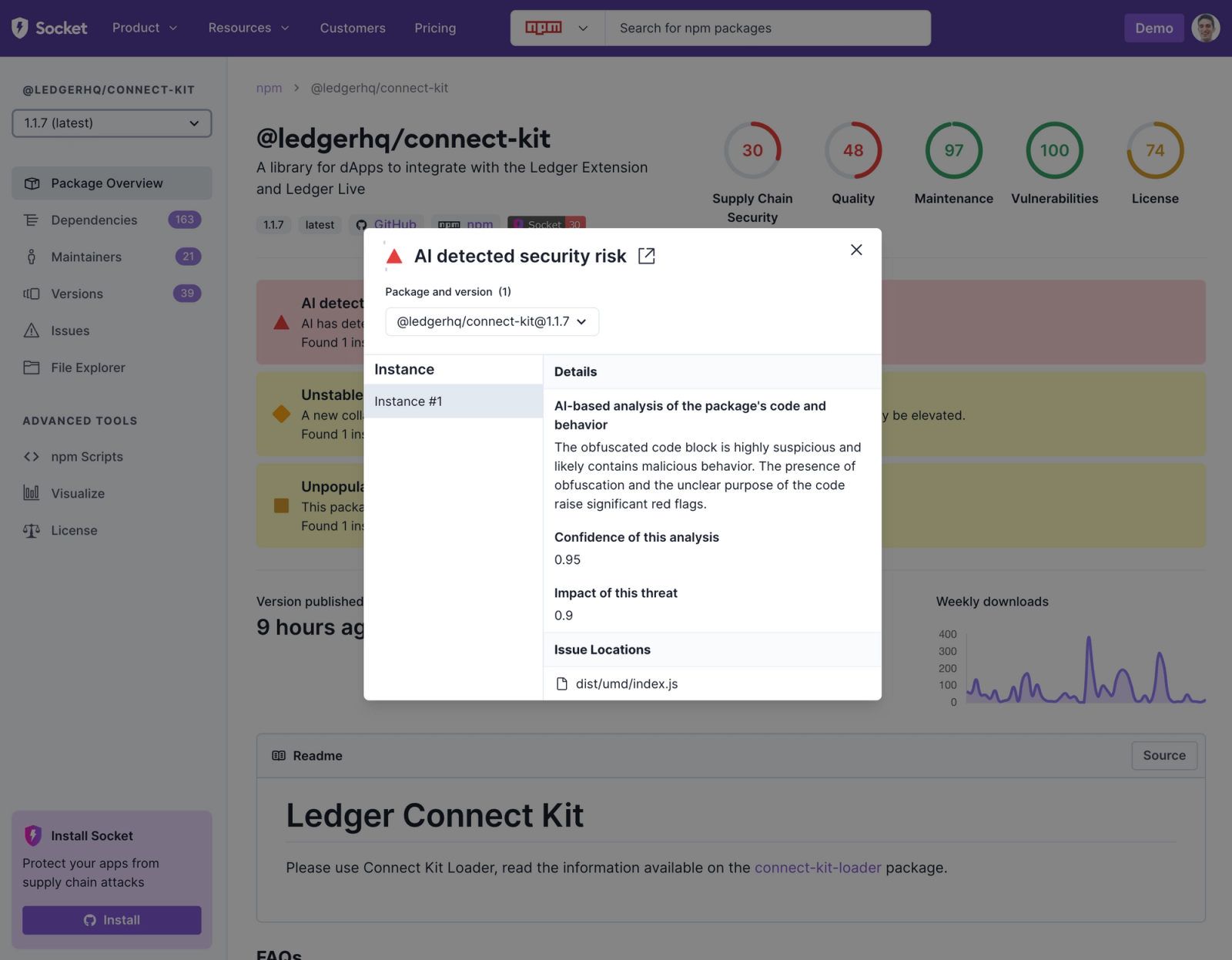 The Ledger Connect Kit was compromised in a supply chain attack, leading to crypto fund theft and highlighting Socket's AI scanner's effectiveness in detecting such threats.