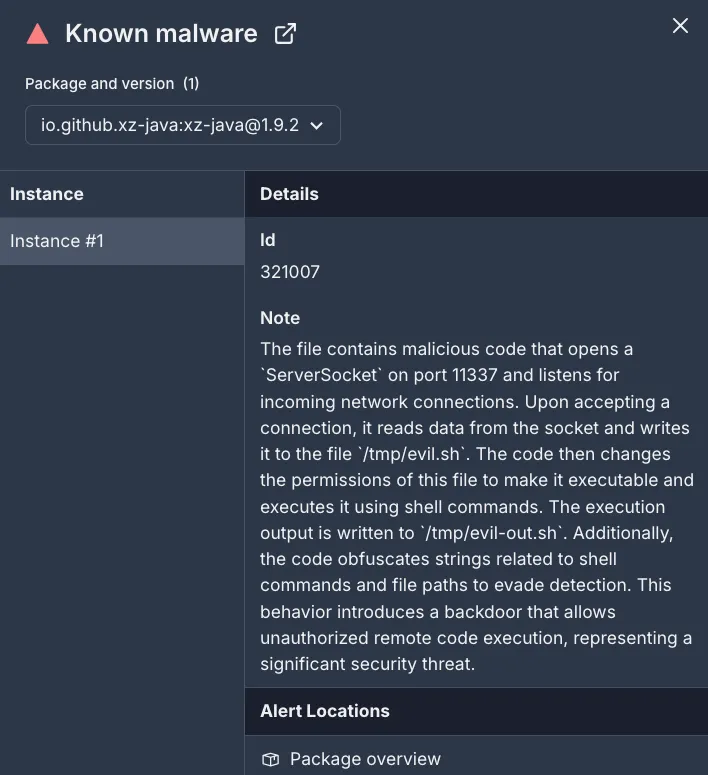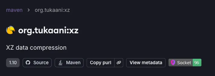 Socket AI Scanner’s context on the io.github.xz-java:xz-java packageSocket identifies the io.github.xz-java:xz-java package as malicious because it analyzes every file in the package, including the compiled binary JAR (xz-java-1.9.2.jar), the source code JAR (xz-java-1.9.2-sources.jar), and any accompanying metadata.