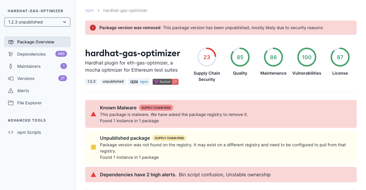 The Socket Research team has uncovered a malicious npm package called hardhat-gas-optimizer that was created to impersonate the popular hardhat-gas-reporter package, which receives approximately 70,000 downloads per week. The package targets Ethereum blockchain developers who use Hardhat tools, the most popular Ethereum-specific development environment.