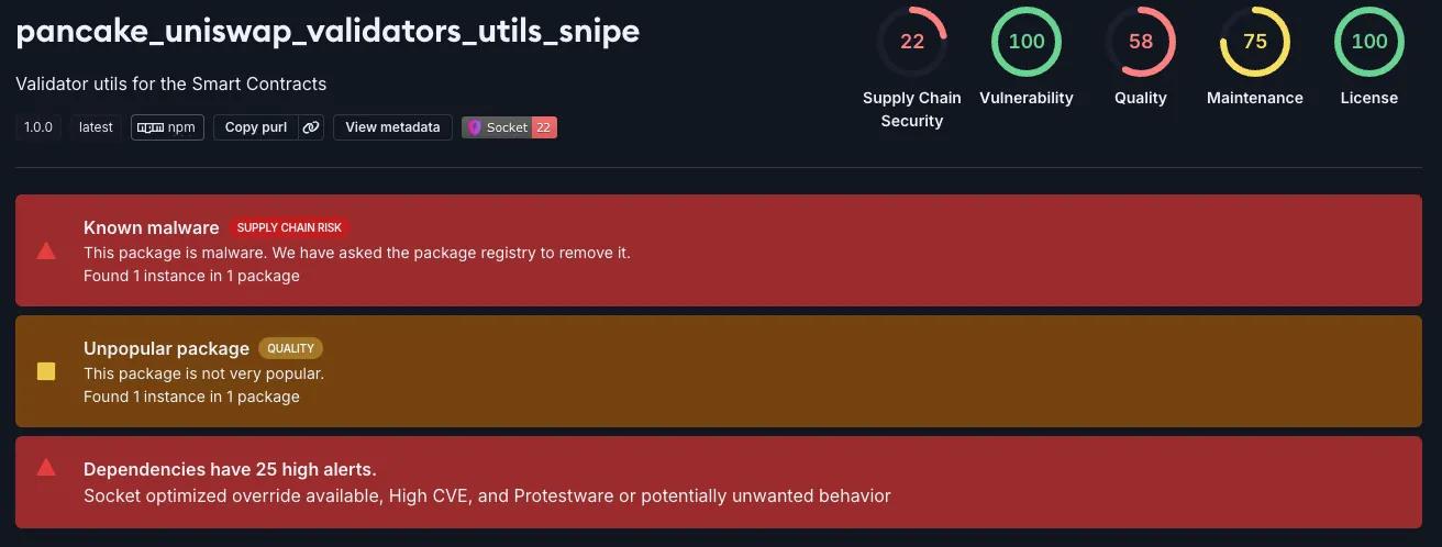 Socket flagged pancake_uniswap_validators_utils_snipe/index.js as malicious.