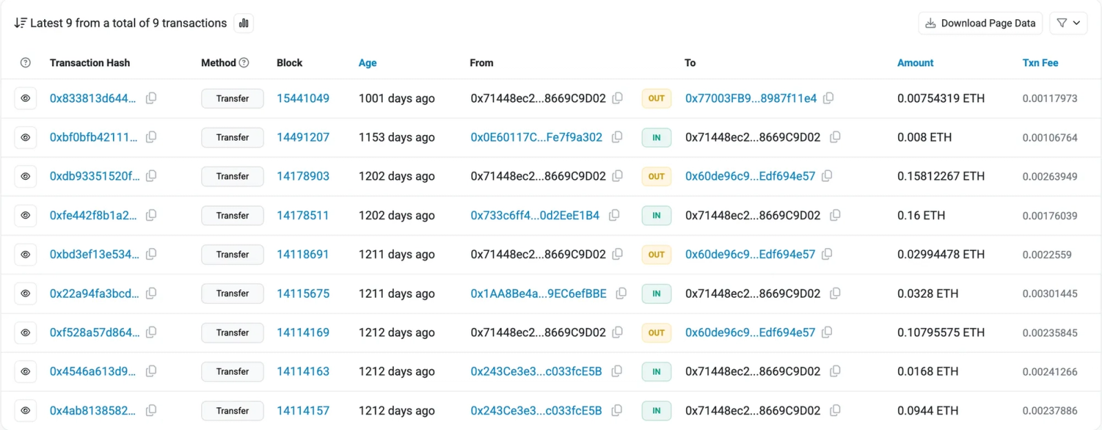 Using etherscan.io to track this address, we can see a total of nine transactions for this address. 1212 days ago, 1211 days ago, 1202 days ago, and 1153 days ago, there were deposits of ETH into this address. From the exchange rates at the time of writing, the total amount is a little below $450 USD. The most recent activity, 1001 days ago at the time of writing, was outgoing to a new address, aligning with the hypothesis that this exploit has not been used in a while. So far, we know that the address was active around the time the packages were released. Since the maintainer profile on npm and Socket’s created date both line up to over three years ago, it is possible that the exploit worked.