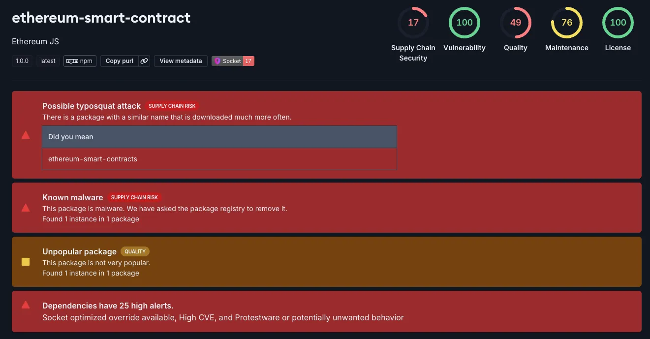 Socket flagged ethereum-smart-contract/index.js, likely a typosquat of ethereum-smart-contracts, as malware.