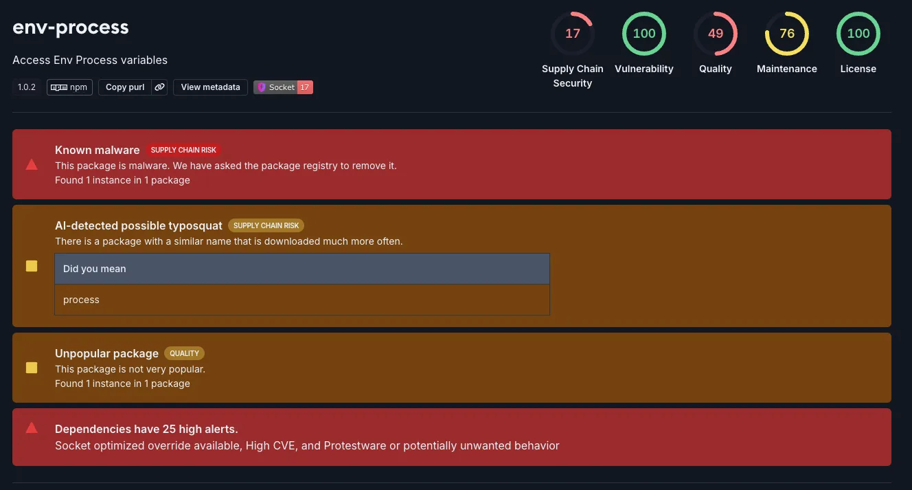 Socket flagged env-process as malware. It potentially typosquats “process” which is a package uses to provide nextTick functionality.