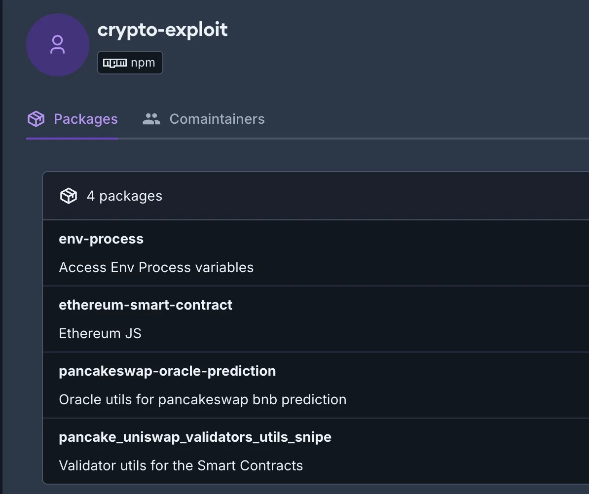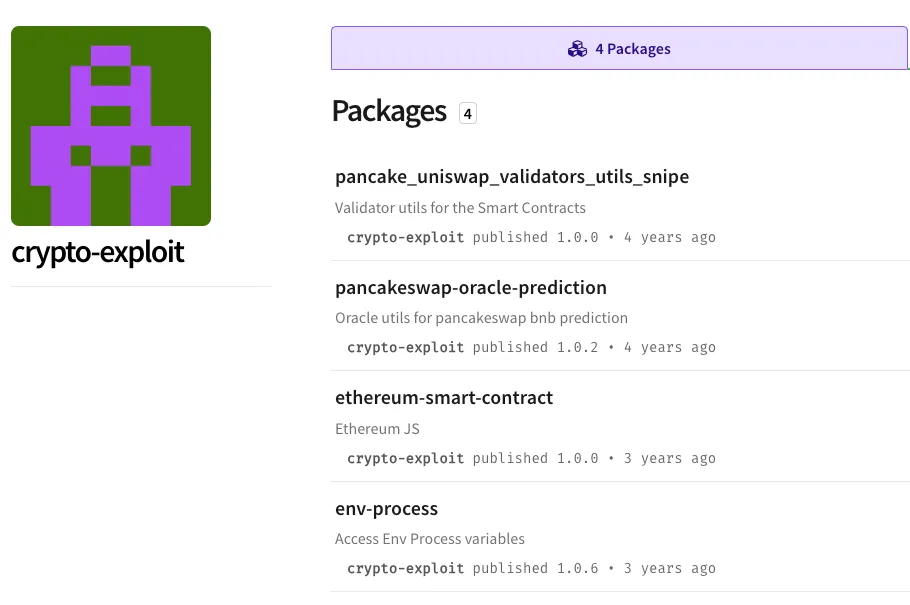 The threat actor wrote these packages between 3-4 years ago. pancake_uniswap_validators_utils_snipe is the oldest, while env-process is the most recent. We have reported them to npm as malware.