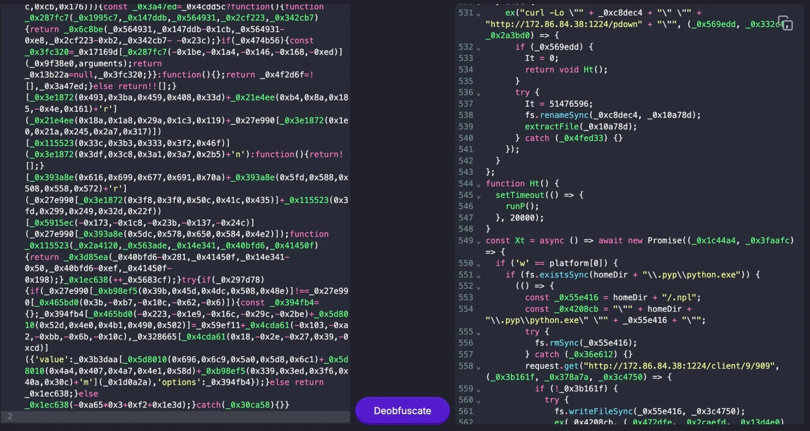 This image displays heavily obfuscated JavaScript code on the left and its deobfuscated version on the right. The original script uses randomized variable names and dense formatting to make analysis difficult — a common tactic in malicious packages. Threat actors often rely on online JavaScript obfuscators to achieve this, while defenders can use free automated deobfuscators to uncover embedded URLs, commands, or payloads.