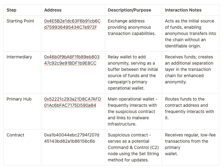 The flow begins with the address (0x4E5B2...), which enables anonymous transactions, passing funds to an intermediary address (0x46b0f9bA...) for further separation. The funds then reach the primary wallet (0x52221c2...), the main operational hub that frequently interacts with a suspicious contract (0xa1b400...), using the Set String method to store or update data. This contract likely acts as a C2 node, allowing the attacker to maintain control over malware deployments securely and persistently through the blockchain. The transaction chain is carefully structured with low-value transactions to avoid detection, demonstrating a novel use of blockchain technology for decentralized and resilient C2 infrastructure.