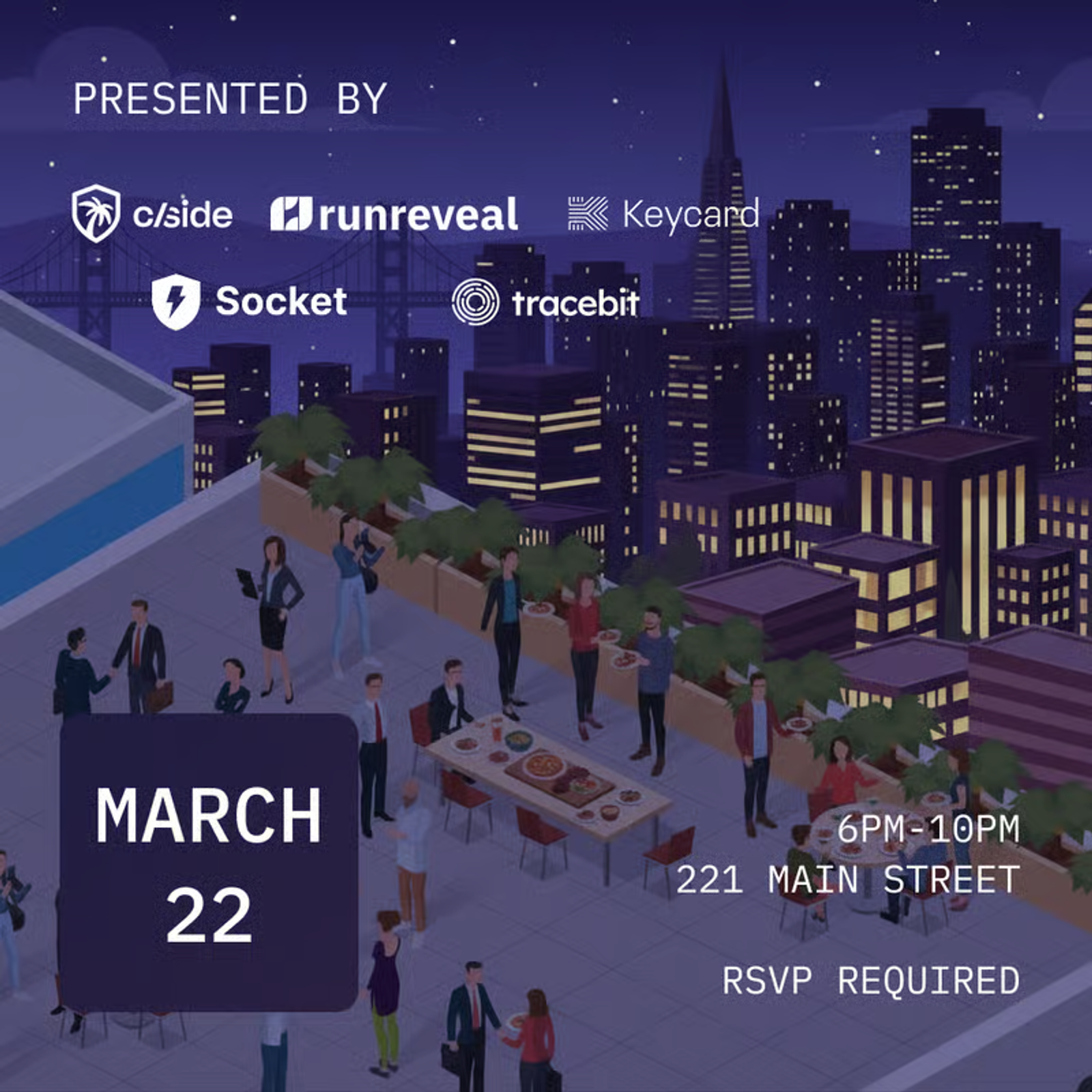 Start the week right. We're joining forces with RunReveal, Cside, Keycard, and Tracebit to kick off RSA week with a rooftop happy hour celebrating BSidesSF 2026. There will be good drinks, great views, and the kind of candid security conversations you don't get on the show floor.