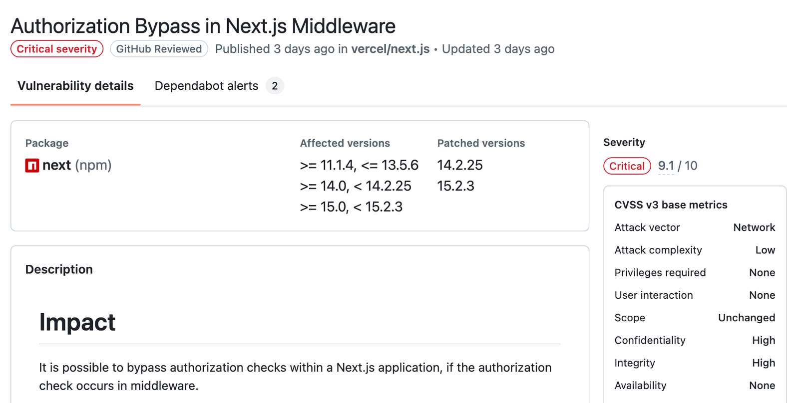 CVE-2025-29927 has been rated 9.1 (Critical) by GitHub, which maintains the Next.js advisory database. With Next.js downloaded over nine million times per week, this vulnerability has far-reaching implications, particularly for enterprises relying on middleware to enforce access controls.