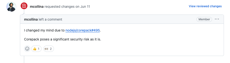 Others have continued the discussion in a previous PR for removing corepack, which has been in discussion since March. TSC member Matteo Collina notably reversed his support for Corepack two months ago, due to its support for downloading the package managers from a source that is not npm.