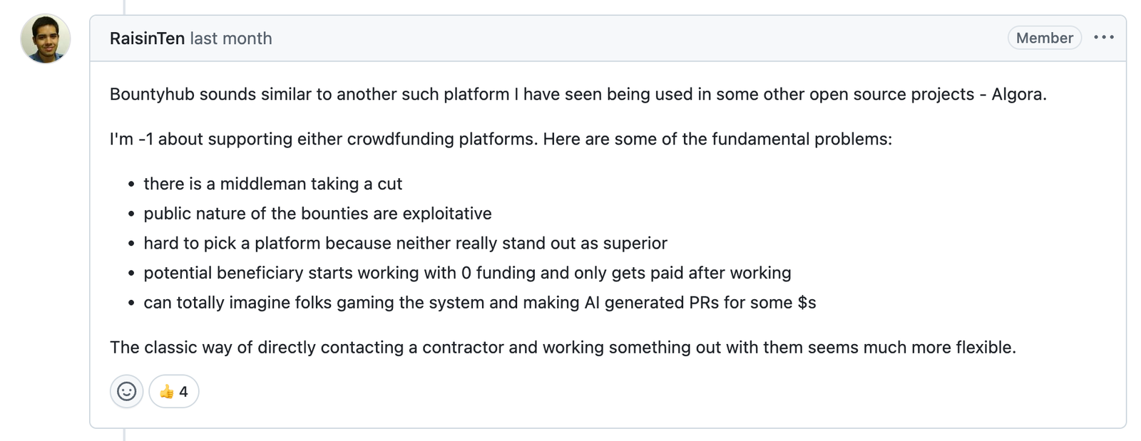 "Also worth considering that users would probably give money for user facing features, while us maintainers would probably want to prioritize some other issues (CI reliability, tooling, etc.) where we're already accumulating tech-debt. Maybe there's a balance to be found, in any case let's make sure we don't worsen an already less-than-ideal situation."