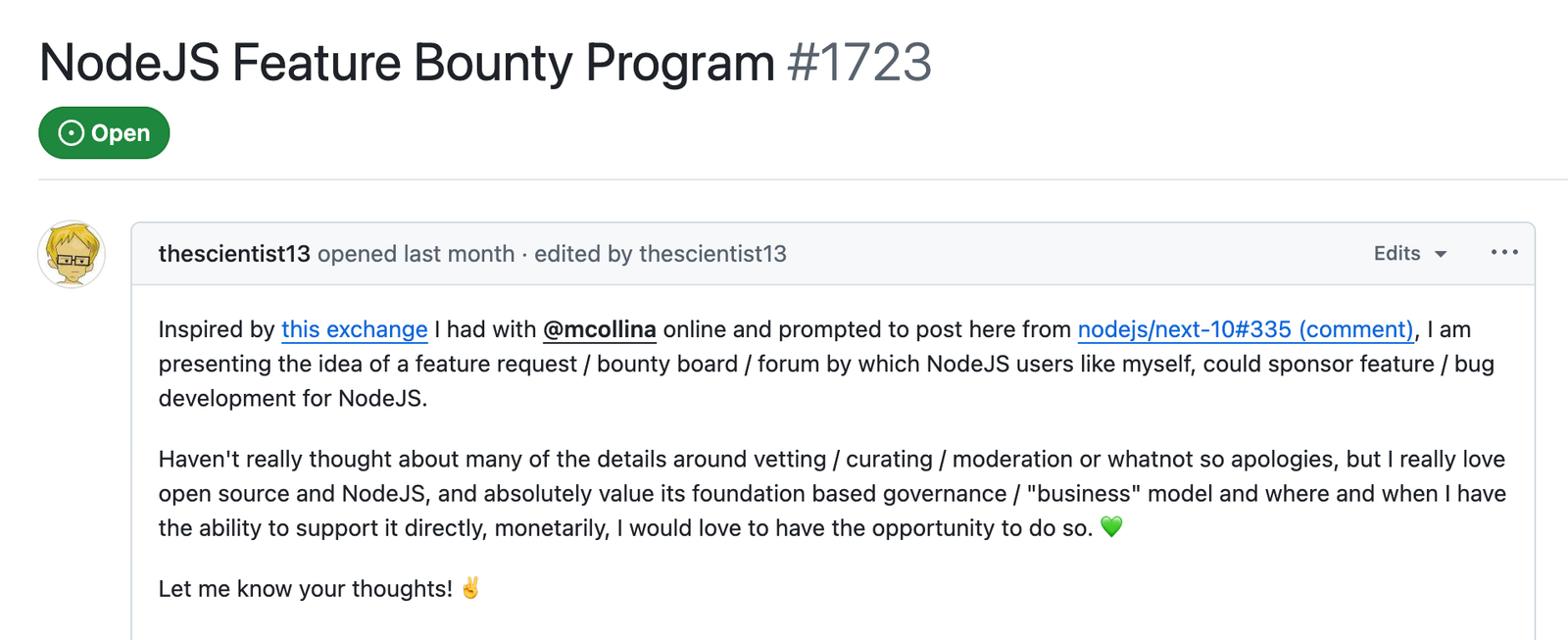 In response, Owen Buckley opened GitHub issue titled NodeJS Feature Bounty Program (#1723), proposing a public bounty or sponsorship mechanism. The idea was simple: allow users or companies to pledge money toward specific feature requests or issues and connect them with interested contributors.