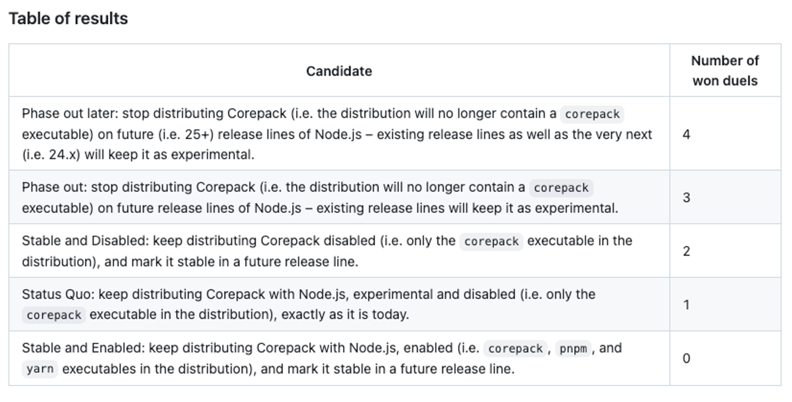 The TSC vote reflected a preference for phasing out Corepack rather than keeping it bundled with Node.js. The winning proposal—"Phase out later"—ensures that Corepack will no longer be distributed with future Node.js releases, while keeping it in Node.js 24 as an experimental feature. Other proposals, including keeping Corepack in Node.js but disabling it by default, failed to gain enough support.