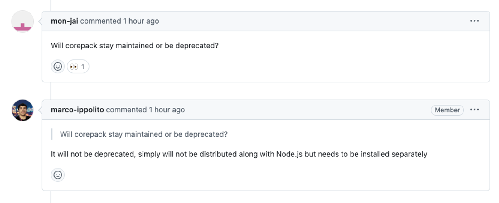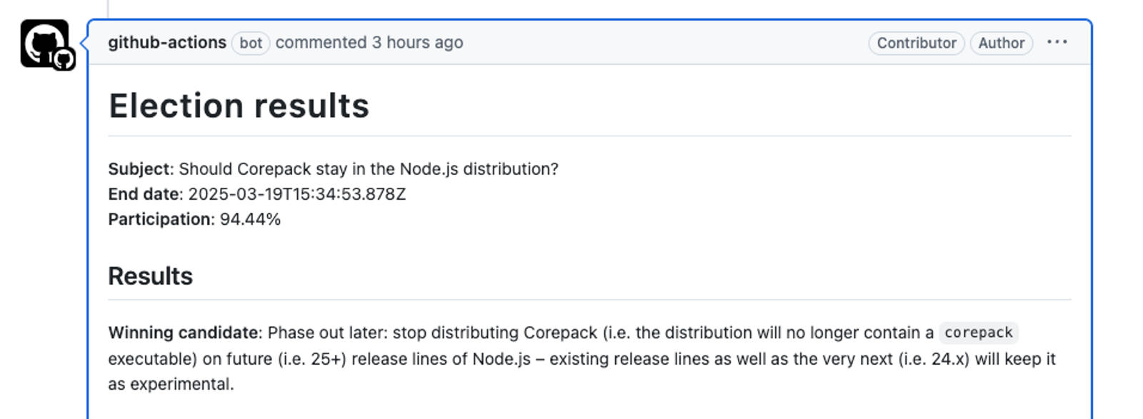 To clarify, the vote does not define Corepack’s deprecation status—only its removal from the Node.js distribution. There are no current plans to deprecate Corepack, and it will continue to be maintained at least as long as Node.js 24.x is not end-of-life (EOL).