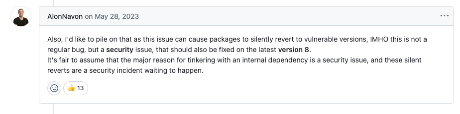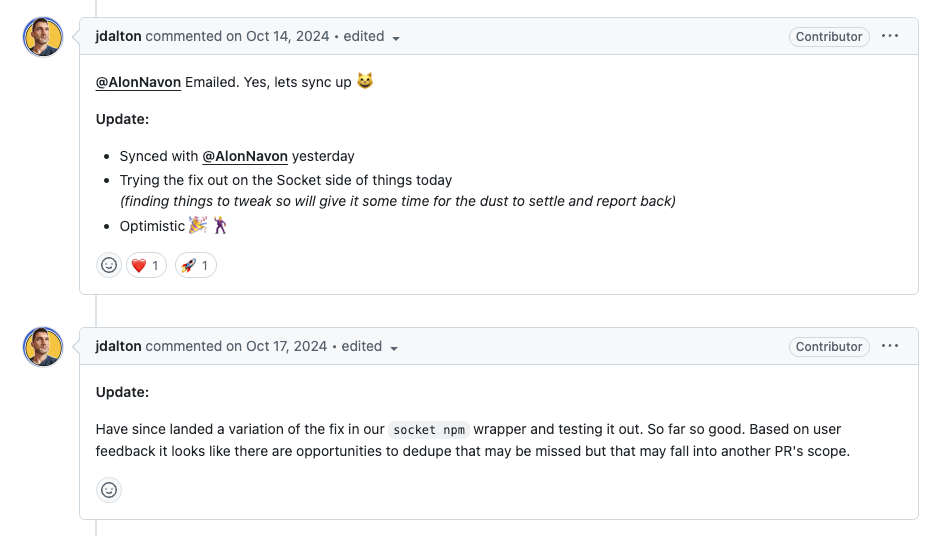 When Socket engineer John-David Dalton began working on Socket Optimize in late 2024, he discovered that the overrides feature—a crucial component for the tool's functionality—still contained this unfixed bug. He got involved to help move the PR forward, leveraging relationships with open source collaborators at GitHub and npm, and worked to get the issue prioritized.