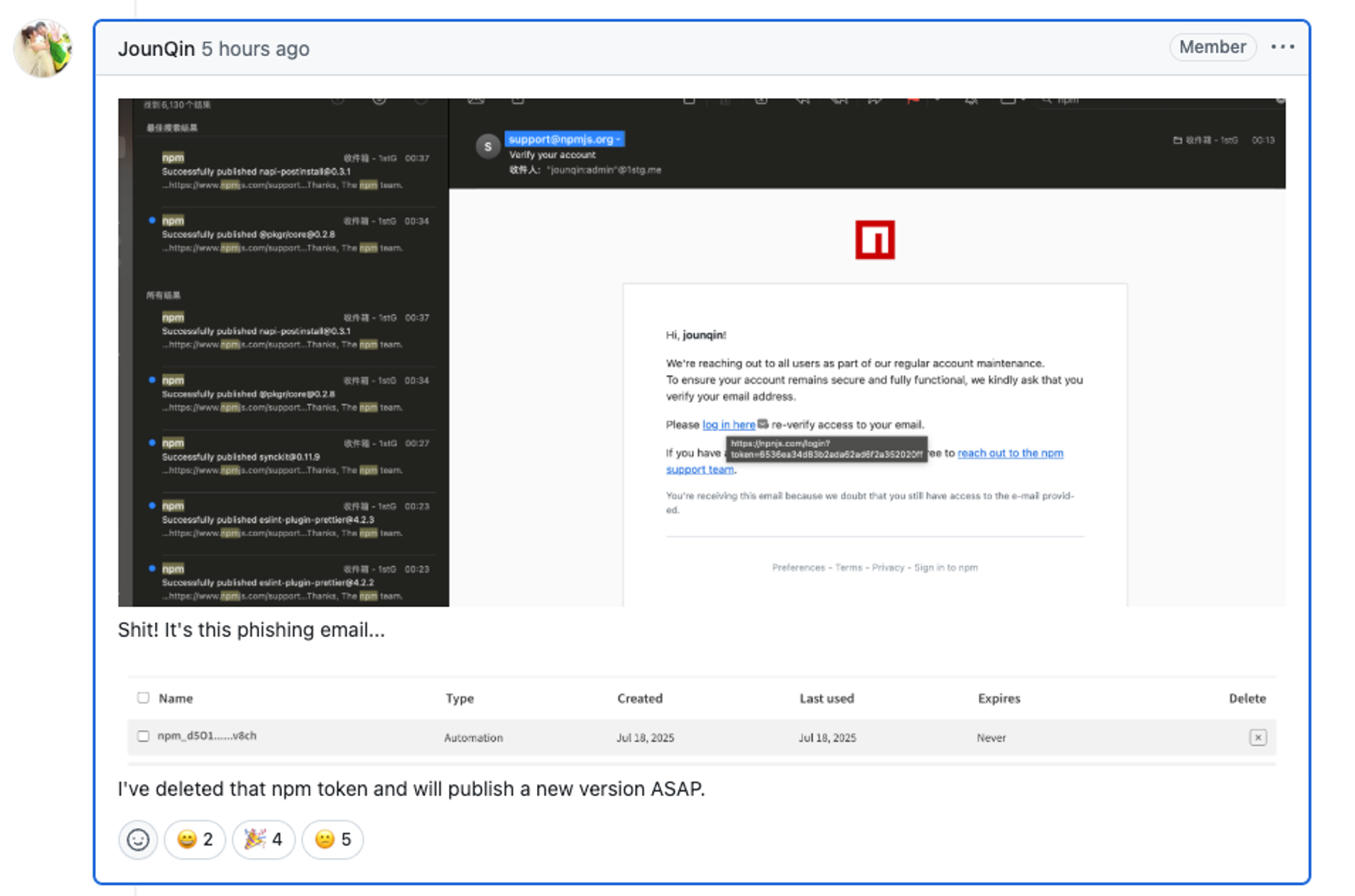 The maintainer confirmed their npm token was compromised via the npnjs.com phishing email. The attackers used the stolen credentials to publish malicious versions of multiple packages without touching the GitHub repos, making the attack harder to spot.
