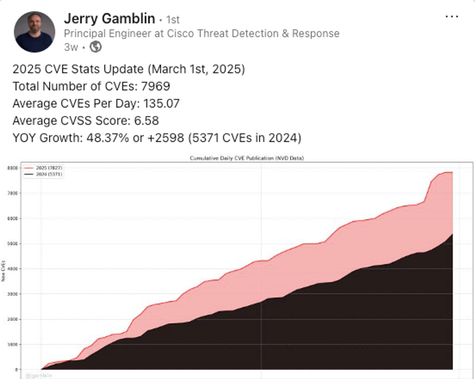 According to a March 1 update from Jerry Gamblin, Principal Engineer at Cisco, CVE publication is already up 48% year-over-year:
