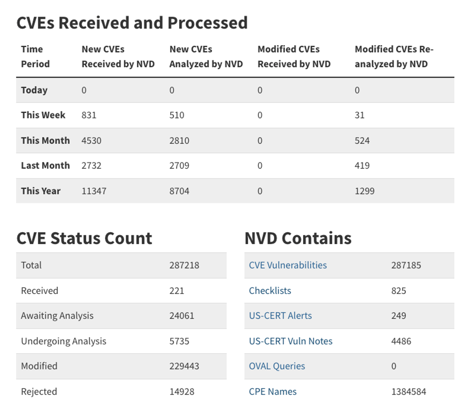 The distinction matters. Many CVEs that are “undergoing analysis” have sat in that state for over a year with no meaningful metadata attached — no CVSS score, no CWE classification, no CPEs. Despite their status, they remain functionally unanalyzed.