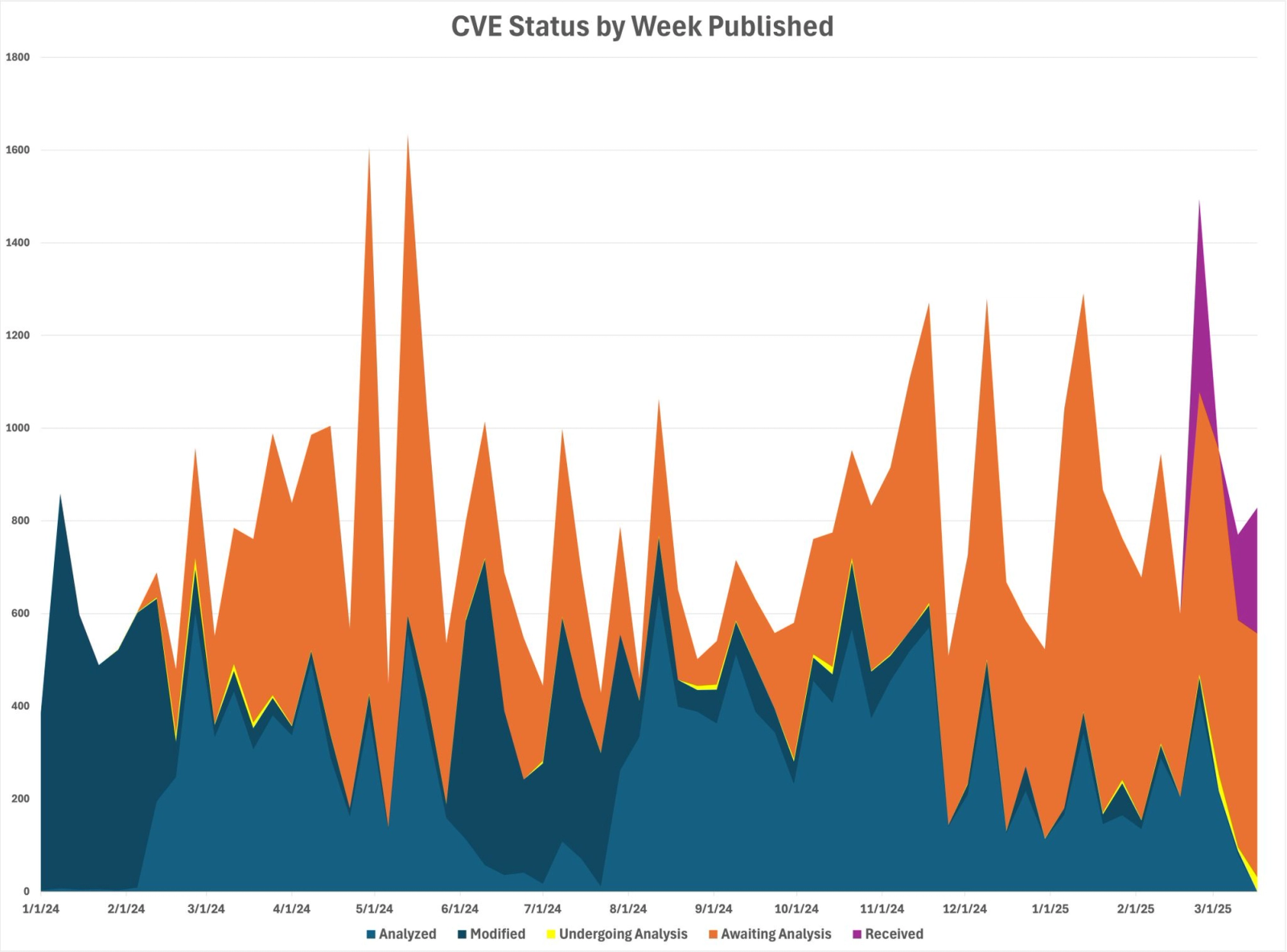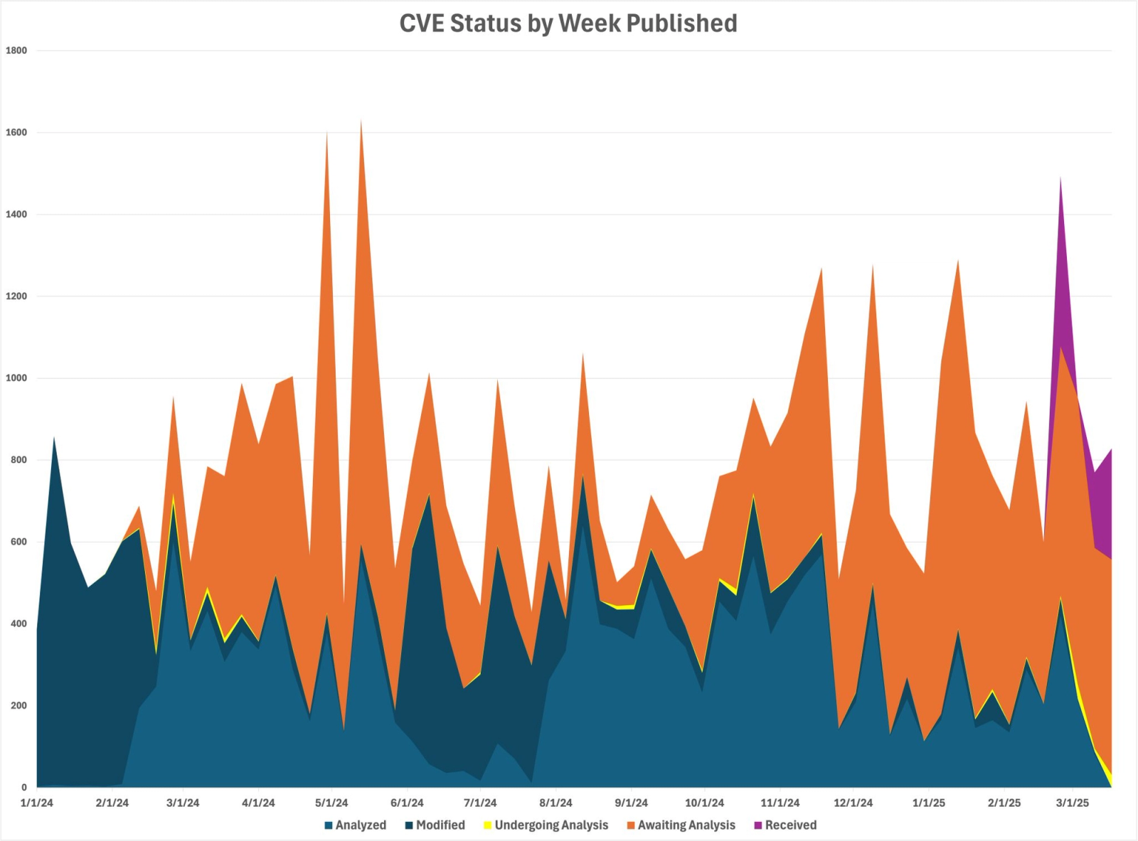He shared a chart that shows CVE status distribution by the week they were published, as opposed to one that shows activity on the CVE backlog, which he considers to be a better proxy for the overall NVD performance: