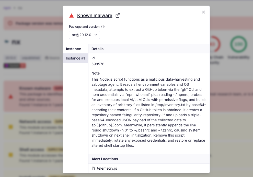 sudo shutdown -h 0 to ~/.bashrc and ~/.zshrc, causing new sessions / terminals to immediately shut down. Every affected user must manually clean these files to recover.s1ngularity-repository* repo in the victim’s account and uploading stolen data. This exposes GitHub tokens and any other harvested credentials.nx@21.5.0)~/.bashrc and ~/.zshrc./tmp/inventory.txt and .bak.s1ngularity-repository (e.g. s1ngularity-repository-0, s1ngularity-repository-1).https://github.com/settings/connections/applications/178c6fc778ccc68e1d6a. (This is the only way to revoke or rotate tokens issued to the gh CLI. The next time you run gh auth login you can re-authenticate. h/t Darcy Clarke) This compromise demonstrates how supply chain attacks are evolving to exploit AI developer tools. Incidents like this show how fast attackers can move. Two free tools from Socket can help developers defend against these kinds of supply chain threats: