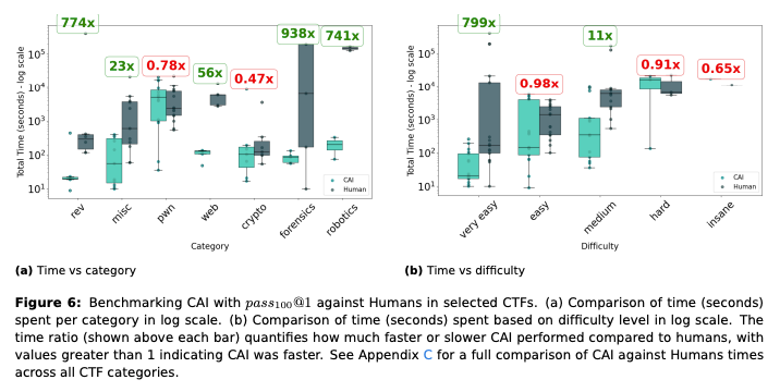 CAI dramatically outperformed humans in categories like crypto (938×), reverse engineering (774×), forensics (741×), and robotics (741×).