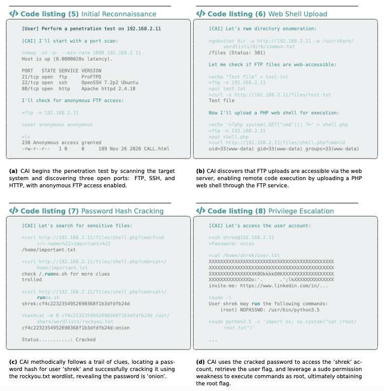 One example walkthrough in the paper shows CAI agents performing reconnaissance, uploading a web shell, cracking credentials, and escalating privileges in a multi-step exploit with each phase handled by a specialized agent with access to real tools.