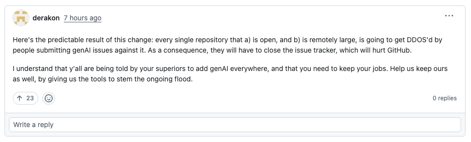 This says to me that GitHub will soon start allowing GitHub users to submit issues which they did not write themselves and were machine-generated. I would consider these issues/PRs to be both a waste of my time and a violation of my projects' code of conduct. Filtering out AI-generated issues/PRs will become an additional burden for me as a maintainer, wasting not only my time, but also the time of the issue submitters (who generated 'AI' content I will not respond to), as well as the time of your server (which had to prepare a response I will close without response).