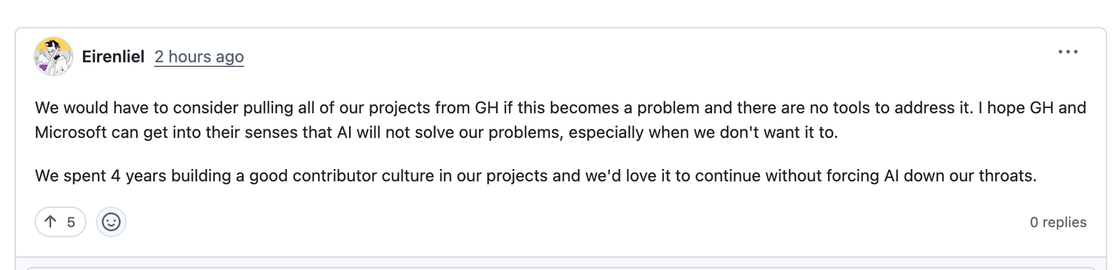 Participants in the discussion expressed concern that GitHub is pushing Copilot deeper into core workflows without offering adequate ways to opt out. While some developers may welcome AI assistance, others argue that the platform should respect projects that explicitly reject machine-generated content, particularly when these submissions arrive with no visible attribution.