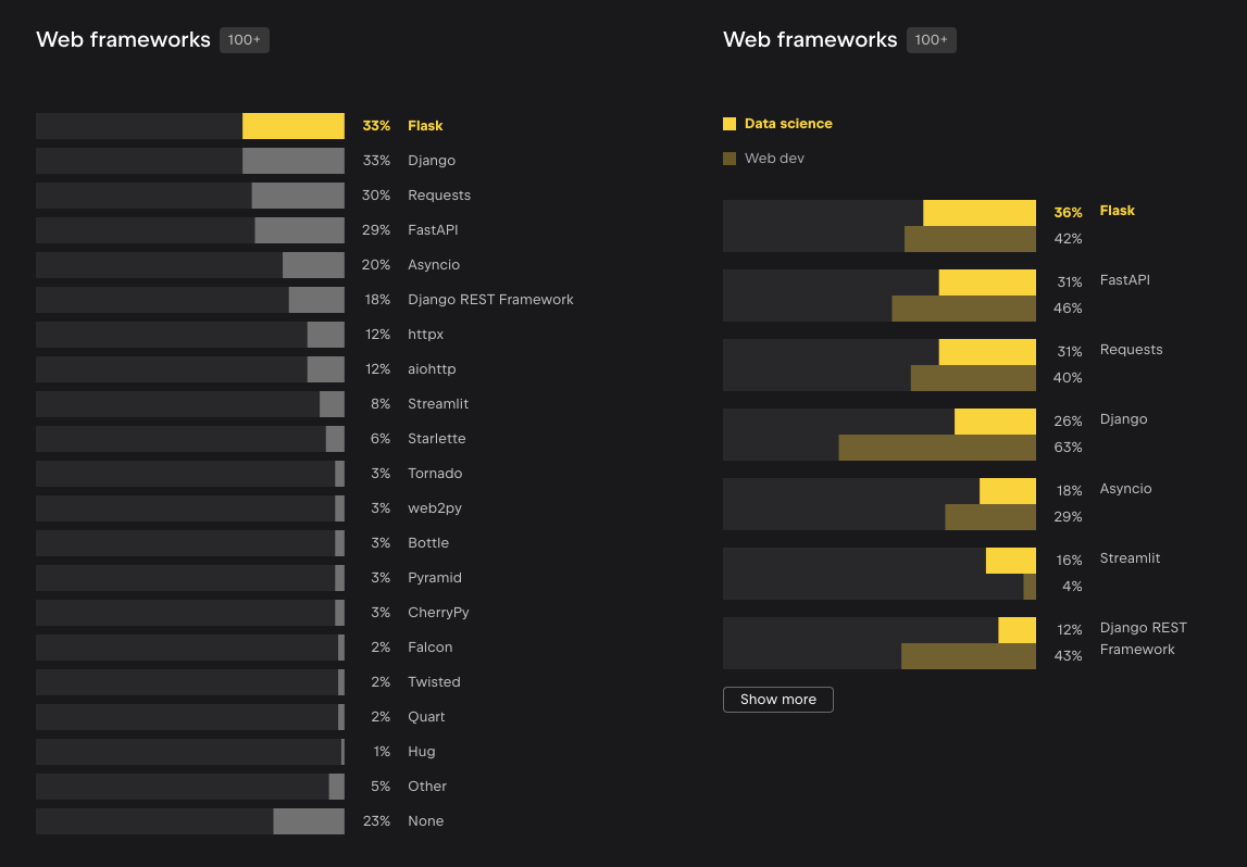 Python developers love their web frameworks, and they are used widely. Among data scientists, 77% report using a framework. That percentage is even higher at 97% for web developers. Usage is divided fairly evenly among a diverse set of the most popular frameworks.
