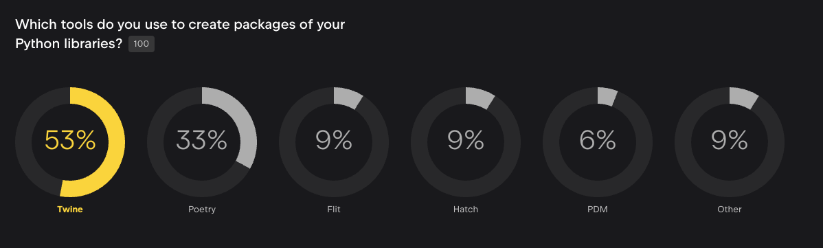 When you take into consideration that 37% of Python developers reported contributing to open-source projects last year, it’s not surprising that approximately 25% of respondents say they have packaged and published Python applications they developed to a package repository. Twine is by far the most popular packaging tool at 53%, followed by Poetry (33%).