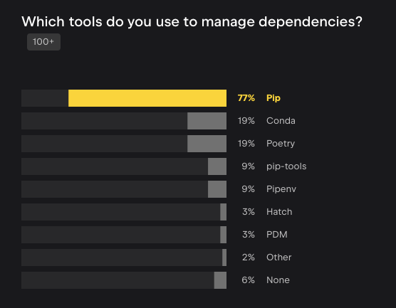 The dominance of pip as the primary tool for managing dependencies, alongside emerging interest in new package managers like uv, reflects a Python ecosystem poised for innovation. This trend aligns with the demographic shift towards a younger, less experienced Python user base. With nearly half of the respondents having three years or less of Python experience, there's a growing demand for tools that are both user-friendly and capable of handling more complex, modern development challenges.