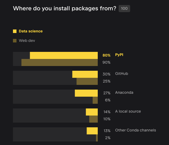 These stats are roughly the same across data science and web development use cases, with PyPI being slightly more popular for web development and Anaconda used more among data scientists.