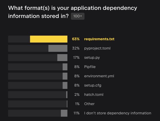 The survey also asked respondents about the formats used by developers to store application dependency information. The most popular format is requirements.txt (63%), followed by pyproject.toml (32%), and setup.py (17%). Other formats like Pipfile, environment.yml, and setup.cfg each have around 8% usage. A smaller percentage use hatch.toml (2%) or other formats (1%), while 11% do not store dependency information at all.
