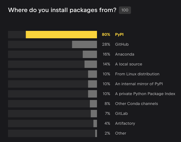 It’s no surprise that 80% of respondents install packages from PyPI. Other popular sources inculde GitHub (28%), Anaconda (16%), and local sources (14%).