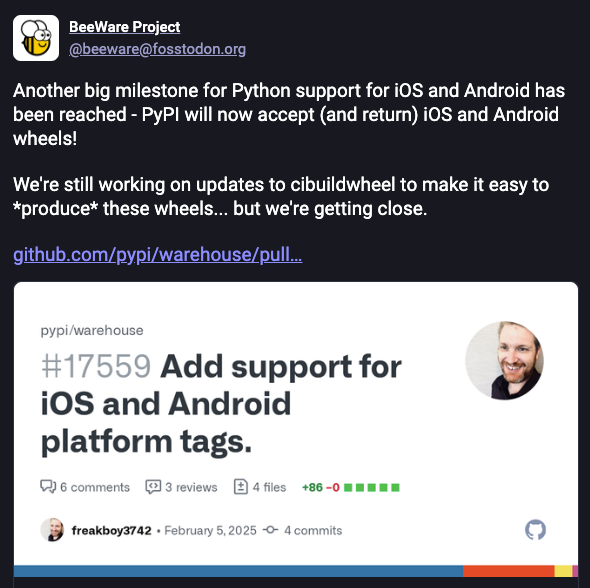 "Another big milestone for Python support for iOS and Android has been reached - PyPI will now accept (and return) iOS and Android wheels! We're still working on updates to cibuildwheel to make it easy to produce these wheels... but we're getting close."
