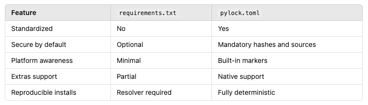 In contrast, pylock.toml is designed from the ground up to be auditable, reproducible, and tool-agnostic—with security and multi-environment support baked in.